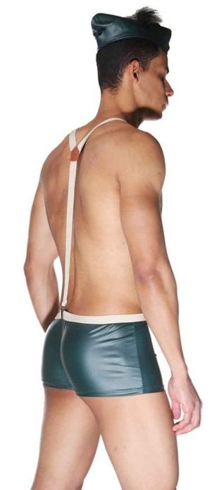 Костюм для мужчин, состоящий из трех предметов: трусов-боксеров, подтяжек и шапочки с перьями. Костюм из плотной гладкой ткани. Шапочка небольшая, также из плотной гладкой ткани, украшена перьями. В комплекте: трусы, подтяжки, шапочка.