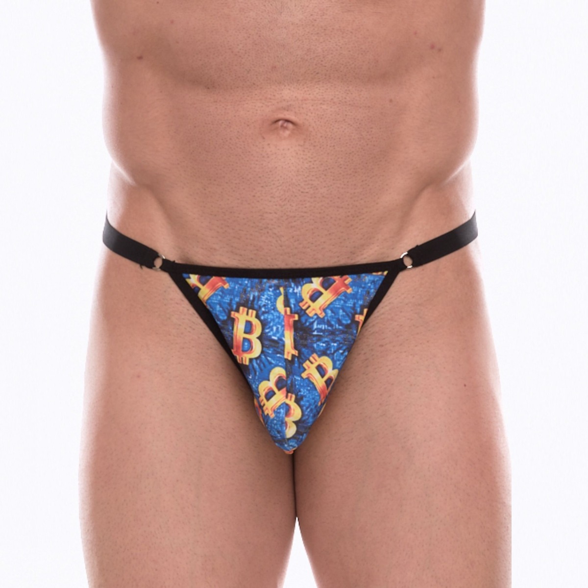 Синие мужские трусы-тонги с разноцветным принтом.