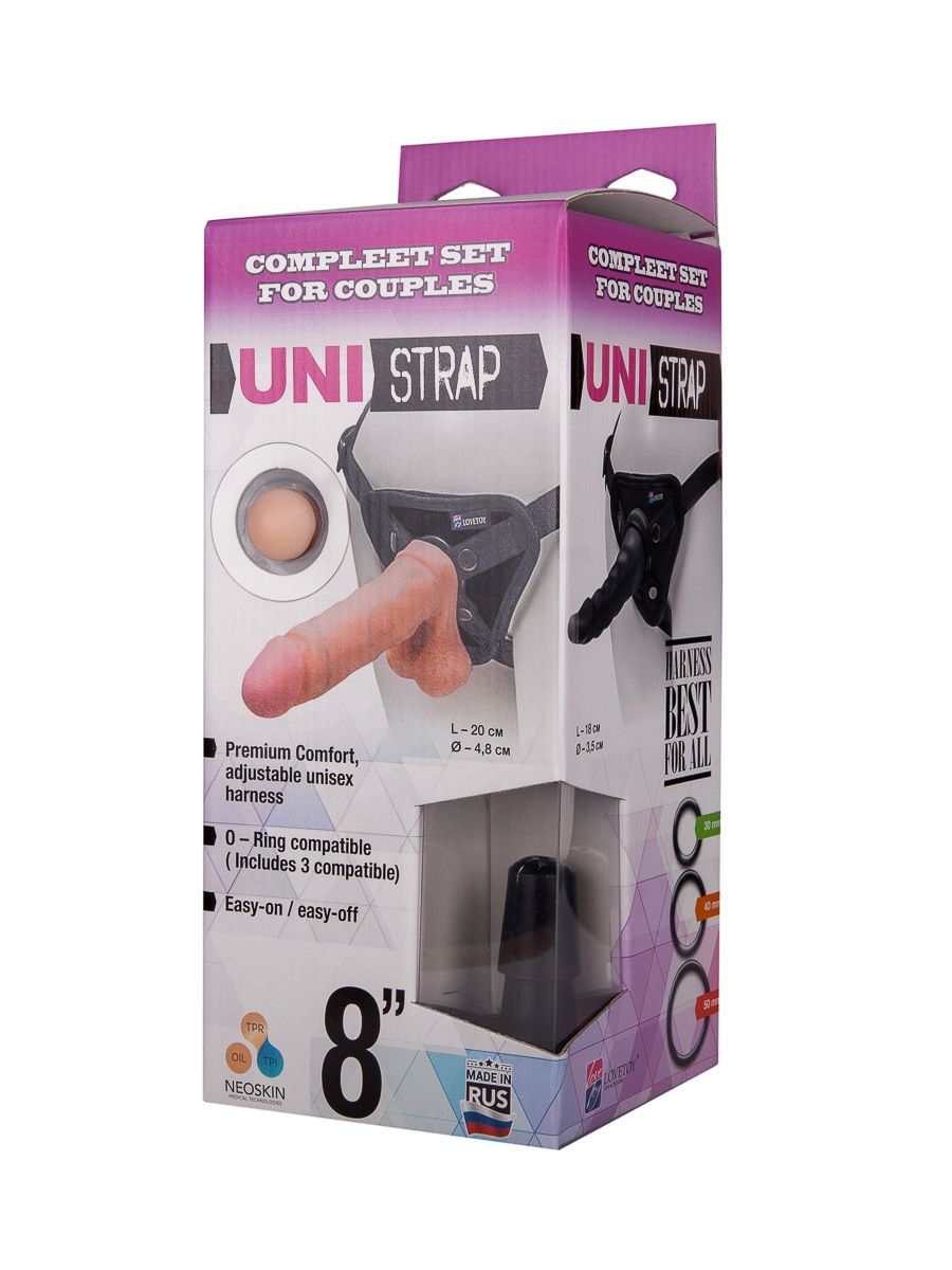 Отличный комплект из трусиков-унисекс, размер которых регулируется длиной ремешков на бедрах, и двух чувственных насадок. Одна из них в точности повторяет формы возбужденного полового члена с мощной головкой, упругим телом и нежной мошонкой, а вторая - будоражит фантазию своими рельефами. Оба фаллоимитатора изготовлены из неоскина - материала, в точности имитирующего кожу человека и делающего ощущения максимально пикантными и реалистичными. Длина телесной насадки - 20,5 см., рабочая длина - 18 см., диаметр - 4,8 см. Длина фиолетовой насадки - 18 см., рабочая длина - 17 см., диаметр - 3,5 см. В комплекте 3 кольца диаметром 3, 4 и 5 см.